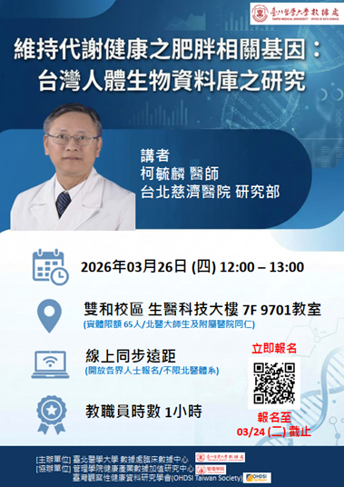 - 演講對象:【實體】北醫大師生及附屬醫院同仁;【線上】開放各界有興趣的朋友報名參加(不限北醫體系)