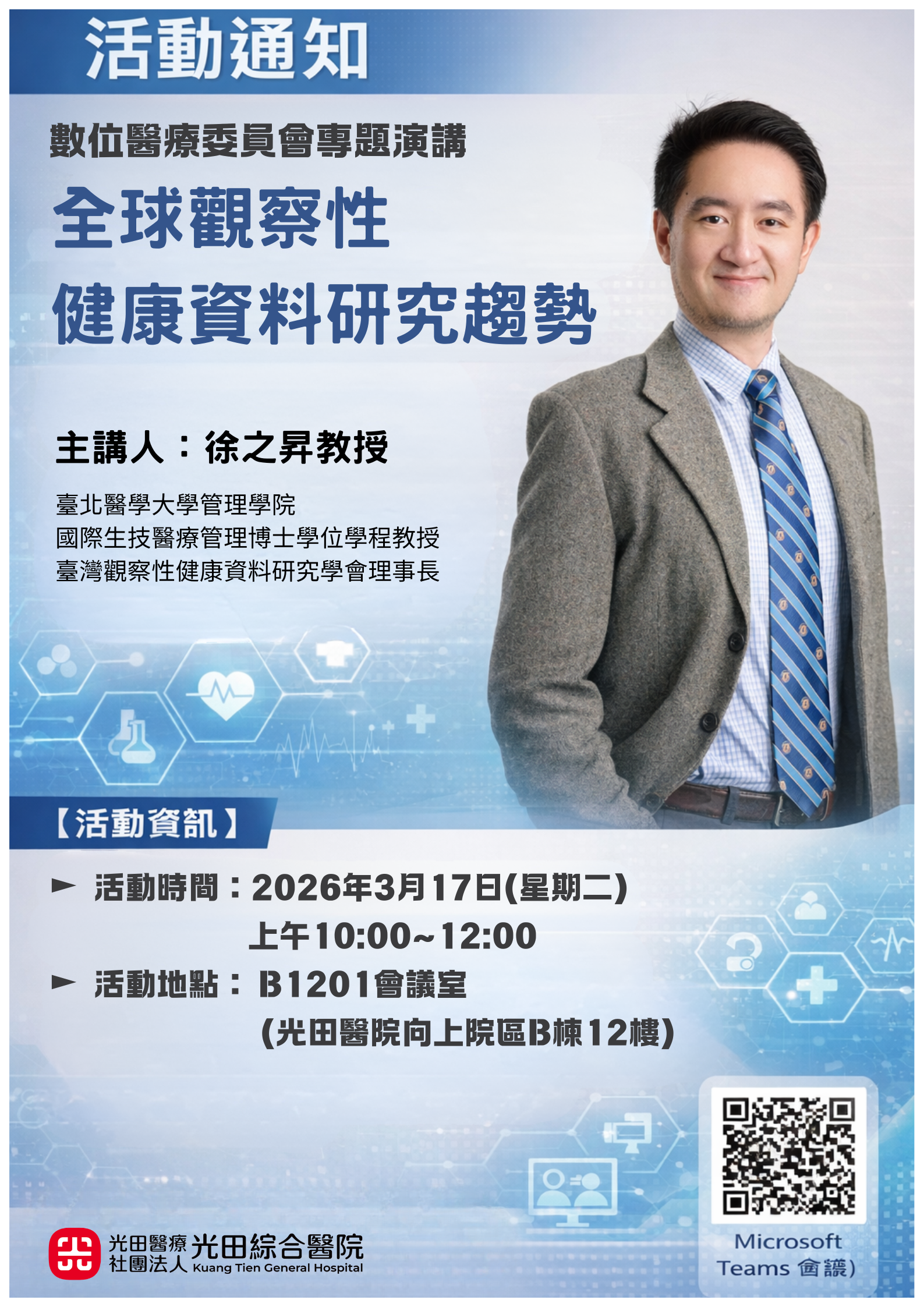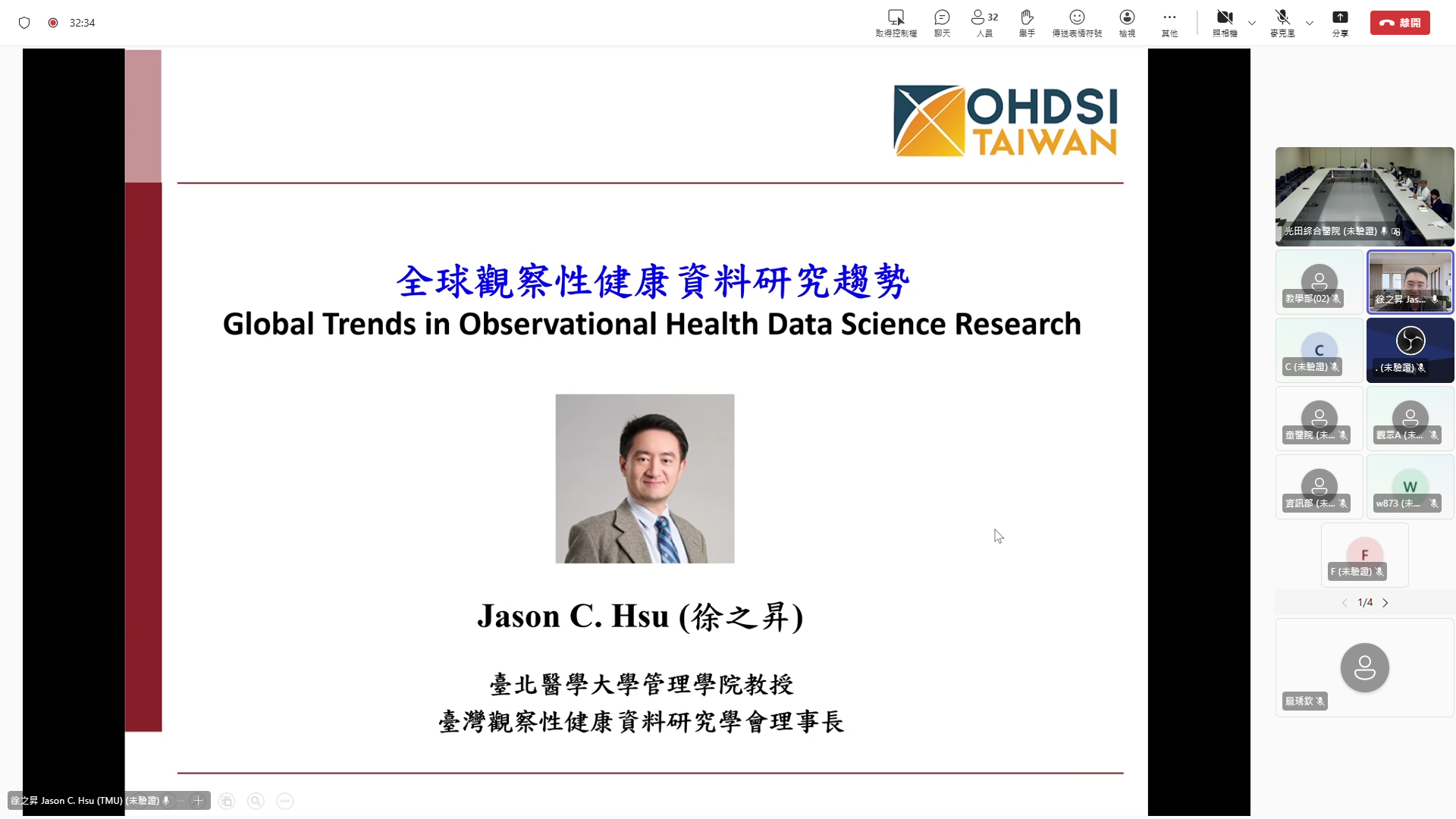 Professor Jason C. Hsu, President of OHDSI Taiwan, was invited to deliver an online lecture at Kuang Tien General Hospital on March 17, titled “Global Trends in Observational Health Data Science Research.” The session highlighted the latest global developments in Real-World Data (RWD) and Real-World Evidence (RWE) and their expanding roles in healthcare and policy decision-making.
